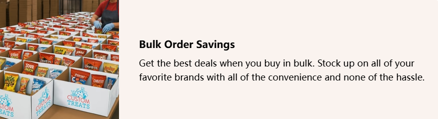 What are the benefits of ordering from My Custom Treats?We provide high-quality, customizable snack boxes tailored to your preferences. Enjoy bulk order savings, a diverse selection of premium treats, and hassle-free delivery for any occasion.